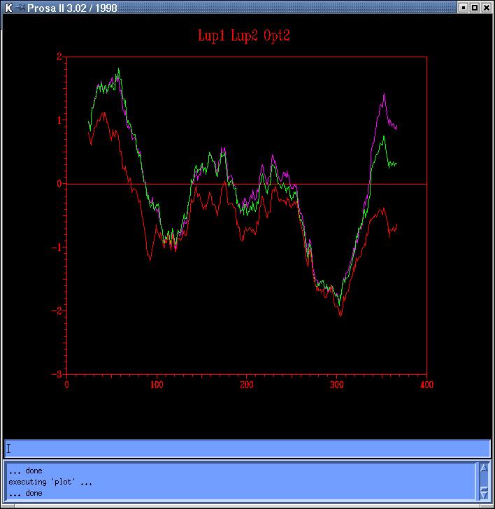 We cannot use Archtype to minimize the energy of the first 100 residues, as the loop found in this region is 12 aa long; we will wait until we run the Molecular Dynamic to see if there is something to do with it. We try anyway with the mentioned program but the results are hopeless: the protein presents 5 loops at the peaks sites, from which just four of them have lengths able to be analyzed through the Archtype (less than 9 residues long). Starting with the fourth loop (parameters), and lowering the cutoff from 60 to 45 (which is rather inefficient) the program gives a list of templates, from which the best is1mro_B (PDBentry), cluster_k, with a score of 100, but after having pasted the loop region to the normal "Template-ProblemSequence alignment", (and subsequent modifications to run the Modeller program), it raises the general energy profile (plot, code: Lup-magenta, Lup2-green, Opt2-red). Since the obtained plot doesn't solve the energetic problem, and given the low cutoff used, we decide not to follow with this strategy.
