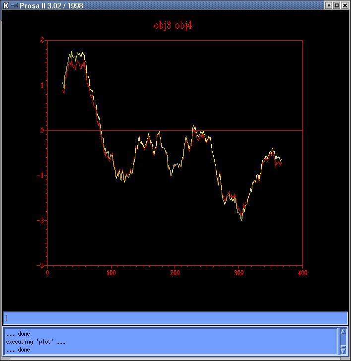 The energy profiles of each model calculated by Prosa II (combined energy plots) shows at least 3 peaks of positive energy, from which the most important is the one at 80 residues, and the other two are at 230 and 250 residues, approximately (Prosa1, Prosa2, Prosa3 and Prosa4). Comparing both sequence based models (obj12prosa.jpg, code: obj1-yellow, obj2-red) and both topits models (obj34prosa.jpg, code: obj3-yellow, obj4-red) we decide to use those with lowest energy profiles (obj2 y obj3) to continue with the optimization (in red in Prosa II plots). The Ramachandran plots (from the Procheck analysis, at 2.5A) show an average percentage of disallowed regions of 0.6% for both models, obj2 and obj3. (0.0% for the template 1g99A.sum).