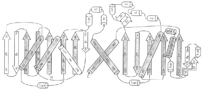 Fig.1 Topologic diagram of the template. The mentioned "bbbababa" core is represented in dark grey; the remaining secondary structures (subdomains) are insertions between particular elements of the beta sheet, typical of each member of the Superfamily