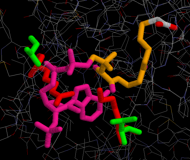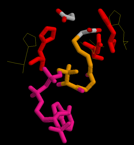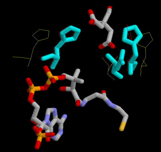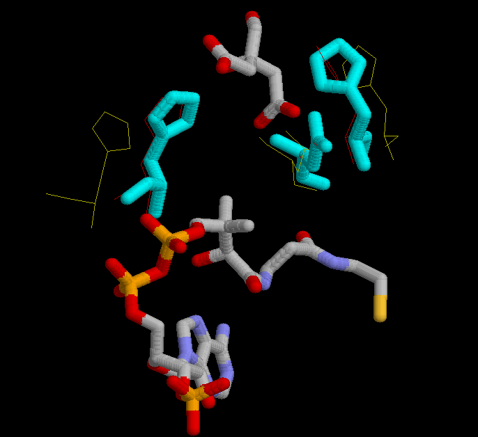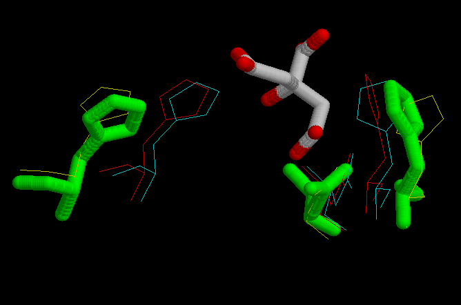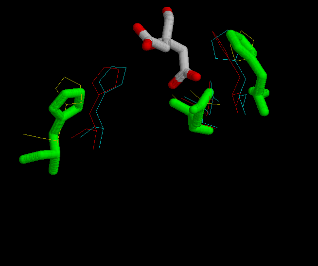 Some of the resiudes that take part in the active site binding pocket remain conserved in the sequence, but some of them have changed, sometimes with afinity enzyme-coenzyme consequences. Oxalacetate molecule binds to the protein by the residues His 211, His 246 and His 287. Acetil-CoA binds to the Arg 296, Arg 370, His 211, His 246 and His 287 in A. aceti protein. Furthermore, Acetil-CoA binds to other residues that have changed in the A. aceti protein. One example is the residue Ala 368 in the chicken protein that has changed to Arg 338 in the A. aceti protein. This residue belongs to the acetil-CoA binding region, so then the A.aceti protein will bind better to the phosphate regions of the acetil-CoA than the chicken one. It is important to note that this arginine is making a bad contact with the Acetil-CoA, what means that its lateral chain has been bad modelled and need optimization. The problem is that we don't have enough tool to make this optimization. Something similar happens with another couple of residues, the Lys 281 of the A. aceti protein and the Val 314 of the chicken protein. This could mean that the binding strength of the A. aceti protein to the acetil CoA is greater than the same enzyme in mammals. (In red residues from A.aceti protein and in green residues from a vertebrate protein).