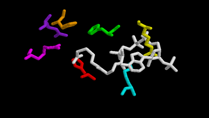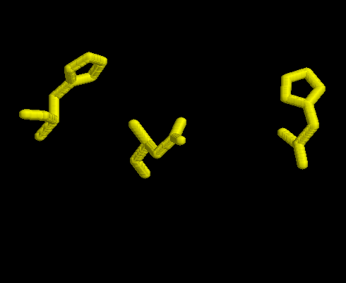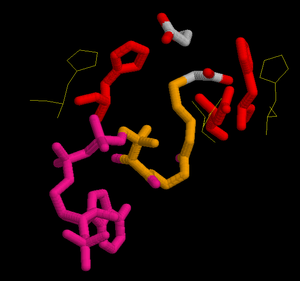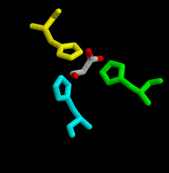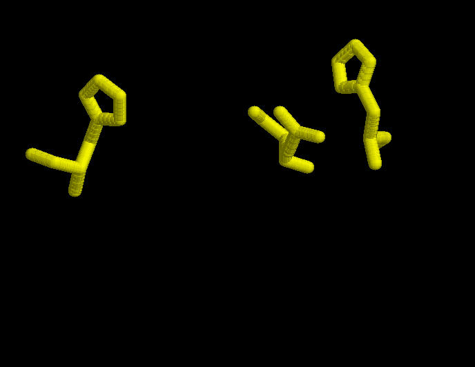 The active sites is located at the interface between the large and small domain of a subunit. There are three crucial residues in the active site responsible from the catalysis. These residues had been mentioned previously, several times. They are His 320, His 274 and Asp 375. So the study will focus on these three residues, and on the changes in conformation that they suffer during de reaction. In the next set of images it it possible to see the motion during the catalytic reaction.