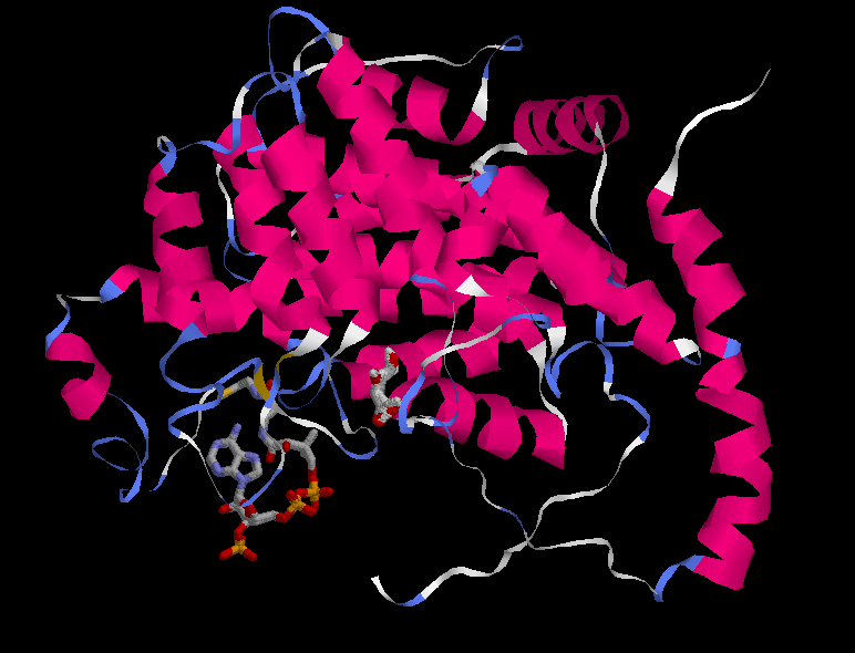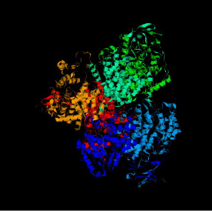 Actually, all the subunits of the protein are identical, which means that all citrate synthases are homodimers or homohexamers. Furthermore, the subunits from dimers and hexamers are equivalent (49 kDa). Each monomer comprises a large domain, containing 15 helices, and a small domain, containing 5 helices, with the active site cleft between them.