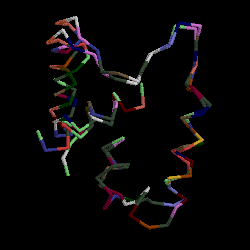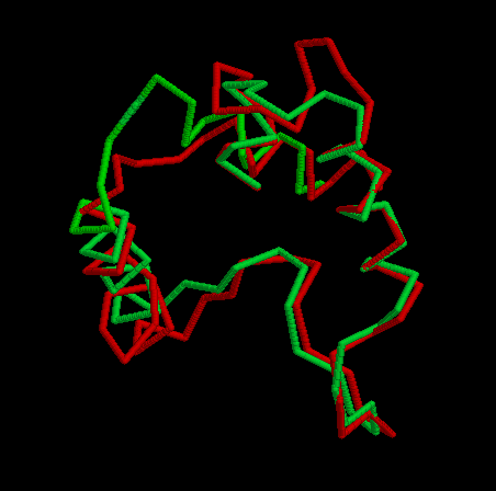 After executing the Modeller program we obtained 4 models for each template. To choose the better one, we analyzed their energies with Prosa software. The pseudopotential energy of the models was in the majority of their residues below zero, which indicates that the models were acceptable. Anyway, there are some regions where the energy is quite high (containing some residues from the active site). At first, it was thought that it was because some basic residues in the active site were linked to negative charges together. I.e. two histidines chained to an oxygen, give rise to very high pseudopotencial energies, because it is very unprobable to find it in an uncomplexed protein. Anyway, these peaks did not appear in the template so this hypothesis was false. Other explanation to these problems had to be found. Eventually, looking at the alignment, this region (arround the resiude 300 from now on) resulted to be the one with more differences in the sequence between the model and the template although when this region was sought in the structure both model and template structure were very similar. In the first picture we can see in red thisregion in the model and in green this region in the template. In the secons picture we can see each residue in a different color. Prosa calculate the energy of the model by means of pseudopotencials looking for the probability that two residues were together. Probably, this region in the Acetobacter aceti's citrate synthase has a different structure, and forcing it to adapt a different conformation making some residues to put together causes a high increase of pseudopotential energies. It would be the possible explanation to this phenomenon.