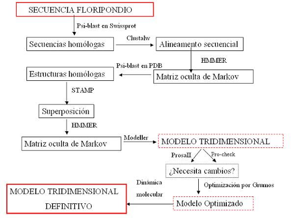 El objetivo de este trabajo es obtener una conformación tridimendional mediante modelaje por homologia de la cell-cycle regulation histidine triad (HIT) related protein del Thermoplasma acidofillus (código de swissprot Q9HIK0). Para ahorraros (y ahorrarnos) esfuerzos memorísticos bautizamos a la susodicha con el nombre de Floripondio (y que a nadie se le ocurra meterse con el nombre).