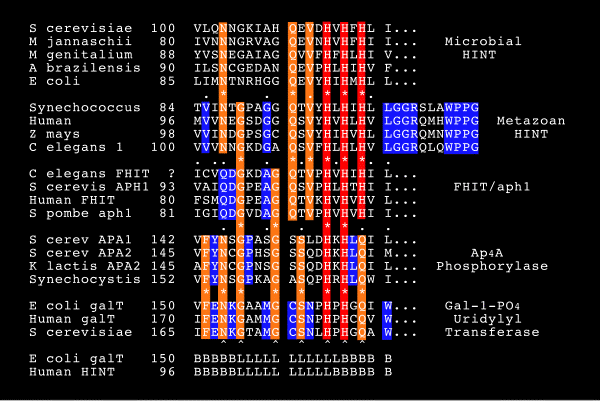 Ellos se conocen como la superfamília de las proteinas con una tríada de histidinas (HIT), más de 35 miembros que presentan como característica una tríada catalítica de histidinas en la región C-terminal. Estas histidinas son capaces de unirse a derivados nucleotídicos, por lo que se cree que tienen la función de hidrolizarlos.