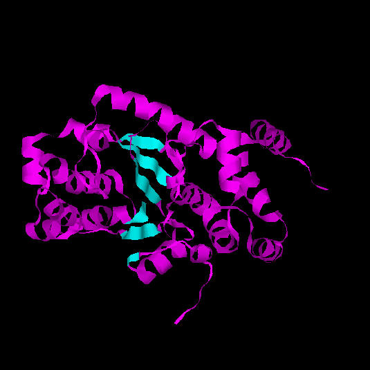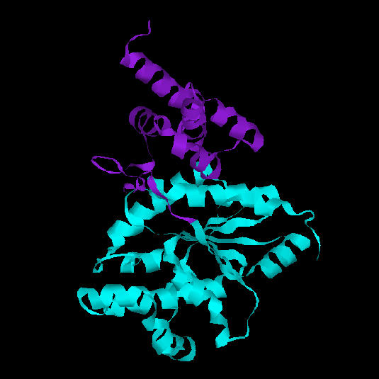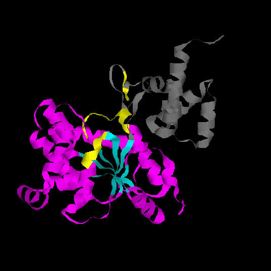 El centre actiu de l'enzim es troba en la fisura formada pels loops de l'extrem C-terminal de les cadenes beta. Aquesta fisura està formada pel canvi d'orientació que s'observa en el diagrama topològic. És en aquesta regió anomenada "topological switch point" on s'uneix l'ATP. Aquest tipus de plegament també es coneix amb el nom de Plegament de Rossman (Rossmanfold), el qual és característic d'unió a mononucleòtids (2).Fig. 10.: Domini catalític amb 6 làmines beta (marcades amb blau turquesa a la figura).