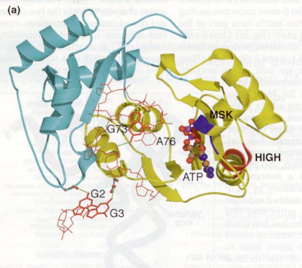 En aquest cas es tracta de la GlnRS. L’ATP i el lloc acceptor del tRNA corresponent estan en vermell. La localització dels motius característics