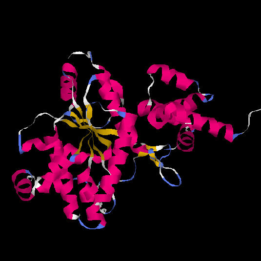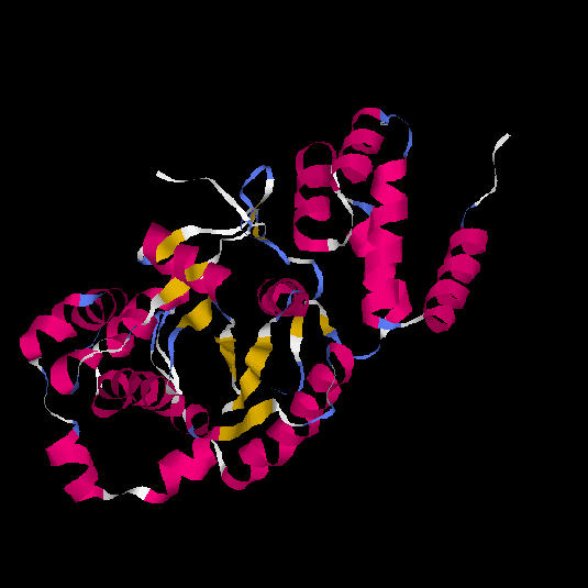 Fig. 11.: Diagrama esquemàtic de l'enzim tirosil-tRNA sintetasa d'Aquifex aeolicus. La regió central del domini catalític (vermell i verd) és una estructura alfa/beta de tipus open twisted amb 6 làmines beta paral.leles. El centre actiu està format pels extrems carboxi-terminals de les làmines beta 2 i 5, en la fisura generada pel canvi de sentit d'aquestes làmines beta. En groc, la primera làmina beta antiparal.lela a la resta.
