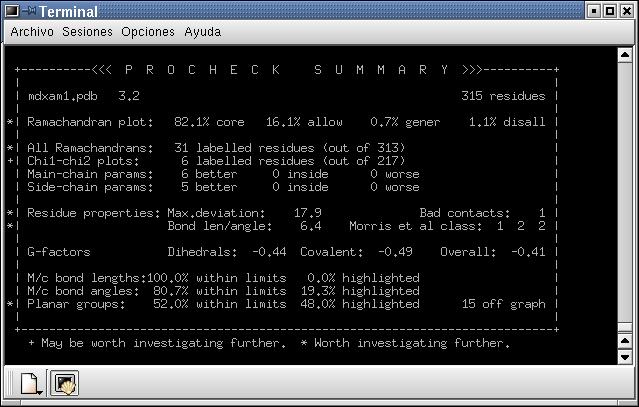 Després de minimitzar les energies mitjançant dinàmica molecular, no hi ha hagut variació significativa d'energies, tal com s'observa a la figura 6A i, comparant la figura 6B amb el sumari del Procheck obtingut en el la minimització d'energies amb el Grumos (figura 5C), no s'aprecien diferències significatives en els resultats. Això fa pensar que la minimització d'energies amb el Grumos ha sigut molt satisfactòria.