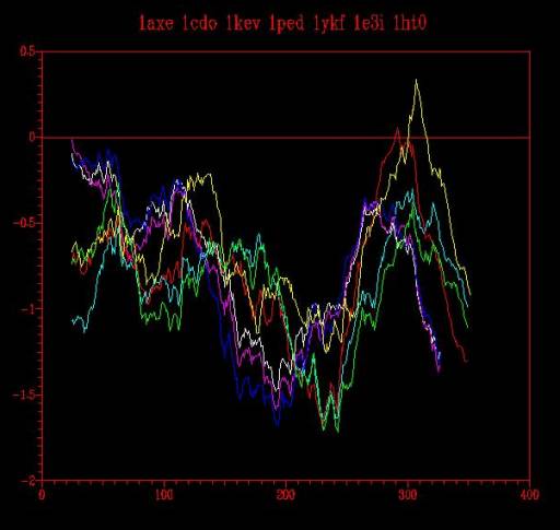 1axe: cyan 1cdo: red 1kev: white 1ped: magenta 1ykf: blue 1e3i: yellow 1ht0: green