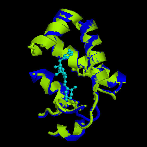 En el caso de las cadenas A, se observó que una de ellas había sido cristalizada acomplejada con vitamina D y la otra no. Se realizó, entonces, un alineamiento mediante el programa XAM y posterior visualización con RASMOL, para comprobar si la unión de la vitamina D provocaba un cambio de conformación en la molécula de DBP, en especial en el dominio I por ser la zona de unión a la vitamina D, pero no se observa ningún cambio apreciable de conformación (Fig 6); se demostró numéricamente calculando el la desviación rms de las dos cadenas obteniéndose un valor de 0.52 Å,muy parecido al existente entre las cadenas B (rmsd:0.59 Å), ambas unidas a vitamina D.