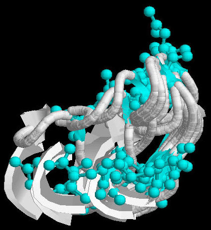 En la estructura cristalográfica de los templates, hay una zona, desde el aminoácido 96 al 102, que no se ha resuelto su estructura, por lo que en el modelo aparece como un loop. Se intentó modelar esta zona con el programa ARCH TYPE que utiliza una base de datos de loops de estructura determinada. Pero no fue posible, ya que no coincidía con ninguno de los determinados en la base de datos.