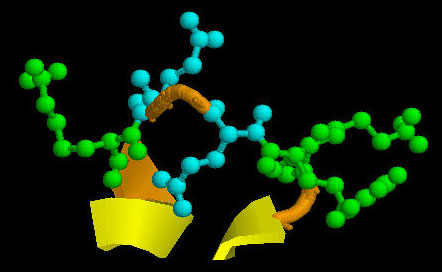 El loop está entre las hélices 5 y 6 del dominio I, concretamente entre las cisteínas 93 y 104, que forman un puente disulfuro entre sí; este hecho provoca que los extremos del loop tengan muy poca movilidad, pudiéndose mover libremente el centro. Analizando la secuencia de esta zona se observa que está formada fundamentalmente por aminoácidos cargados; concretamente hay una lisina (carga +) y un ácido glutámico (carga -) seguidas y separadas por una glicina y una leucina de otro ácido glutámico, una lisina y un arginina (Fig 8).