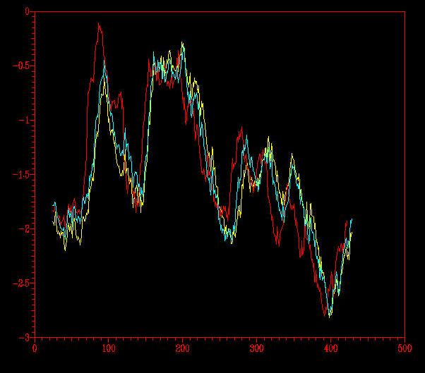 Fig 7. Resultados PROSA. En rojo,template (1J78) en amarillo, modelo optimizado y en cian, modelo no optimizado.