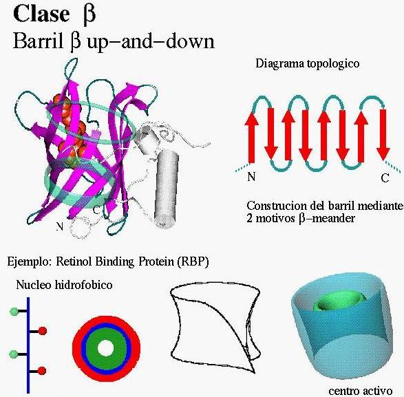 Successió de cadenes beta. L'última cadena s'uneix a la primera mitjançant ponts d'hidrogen, de tal manera que el barril queda tancat. Les cadenes son antiparaleles. La part interior es hidrofobica i l'interior hidrofílica