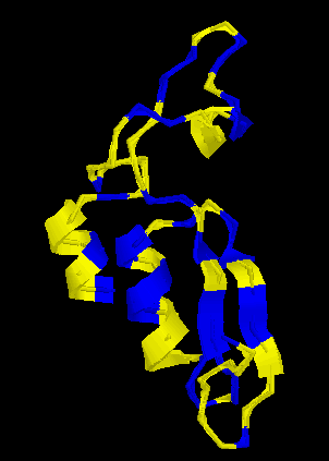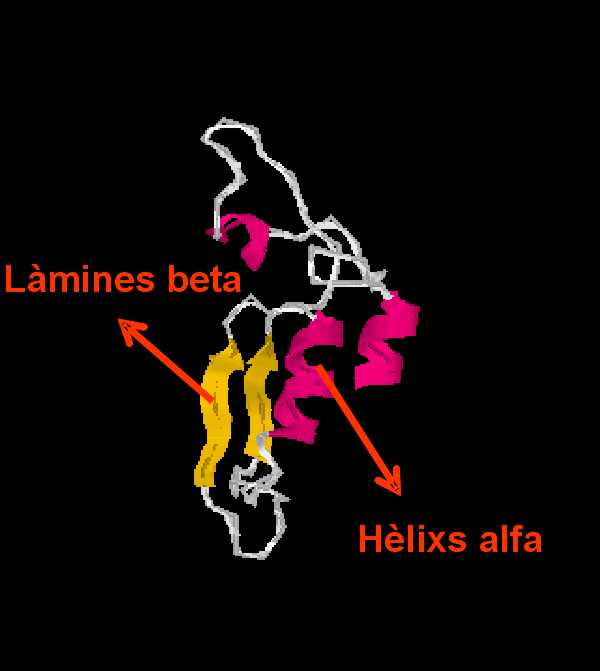 ![]() | En aquesta imatge apareixen els residus polars (color groc) i els residus hidrofòbics (color blau) tant a les hèlix α com a les làmines β. |