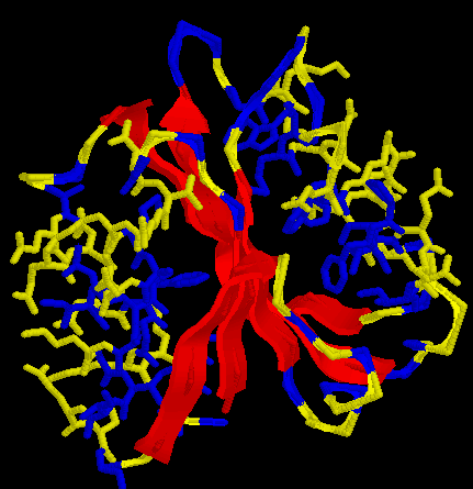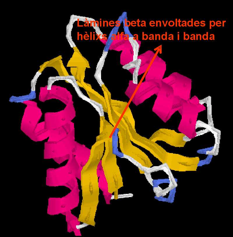 ![]() | En aquesta imatge en canvi, es destaca el conjunt de làmines β envoltades per nombroses hèlixs α (sticks), tot observant un cop més com el centre de les làmines està format per residus no-polars i els extrems de les mateixes làmines, per residus més polars.. |