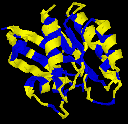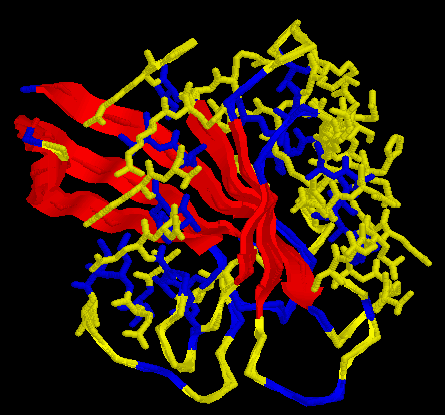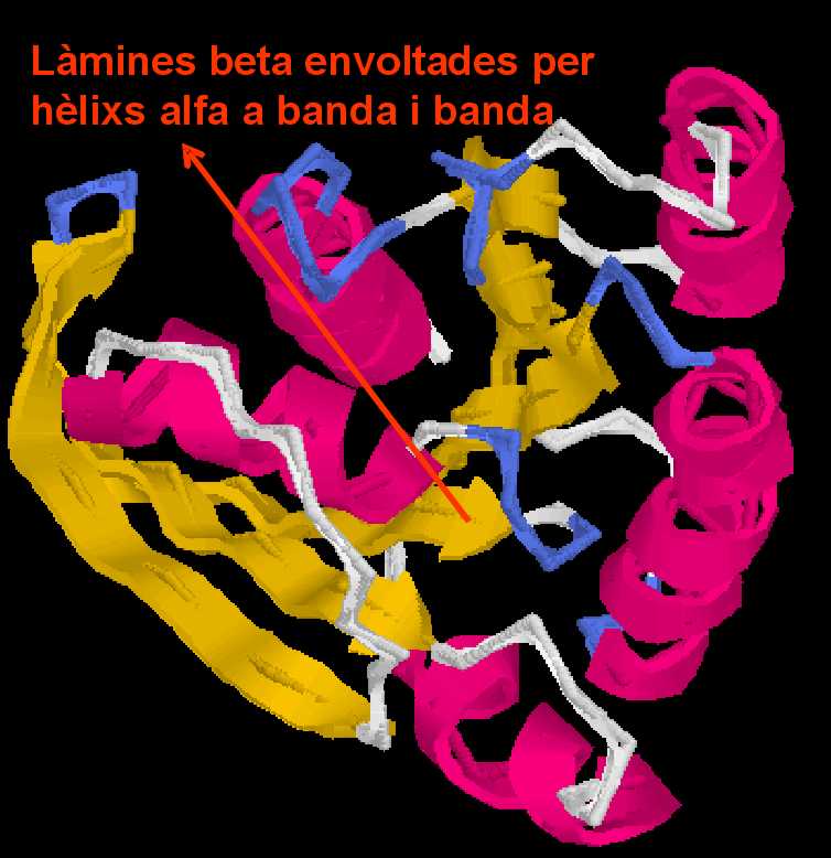 ![]() | En aquesta imatge en canvi, es destaca un conjunt de làmines β envoltades per hèlixs α (sticks), i observem un cop més com el centre de les làmines està format per residus no-polars i els extrems de les mateixes làmines, per residus més polars.. |
