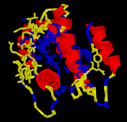 ![]() | A la imatge de l´esquerre, apareix una visió general de la disposició dels residus polars (color groc) i els residus hidrofòbics (color blau). |