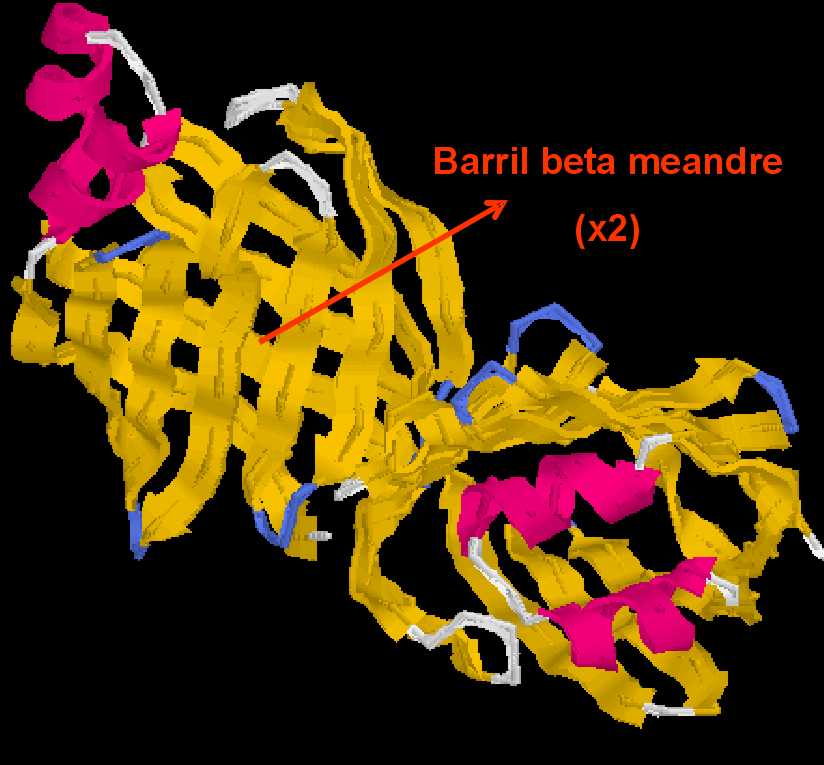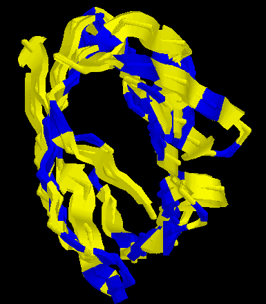 ![]() | En la present imatge , es destaca la disposició dels residus polars (color groc) i els residus hidrofòbics (color blau), tot mirant per dalt del motiu barril β meandre. |