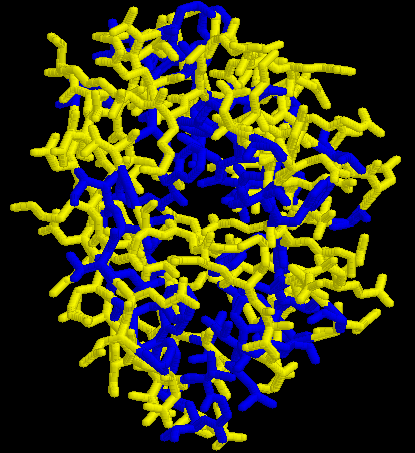 ![]() | En aquesta altra imatge (sticks), es pot apreciar intuïtivament com els residus més externs són polars a l´igual que els més encarats al interior del canal que conforma aquest motiu, mentre que els residus que estan més protegits (entre les dues superfícies d´interacció més polar), són fonamentalment hidrofòbics. |