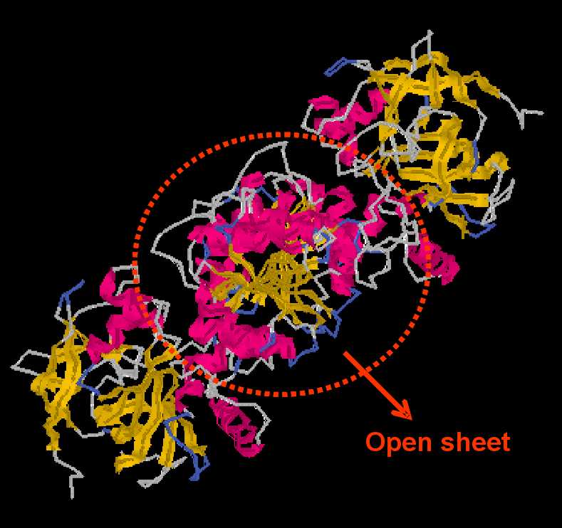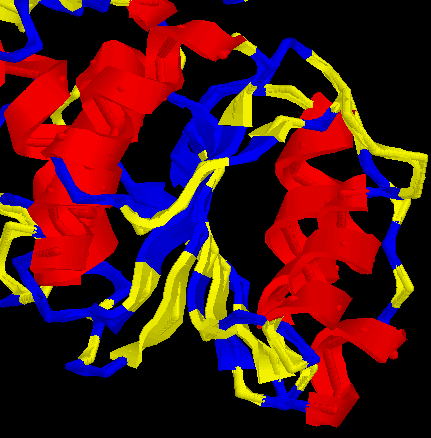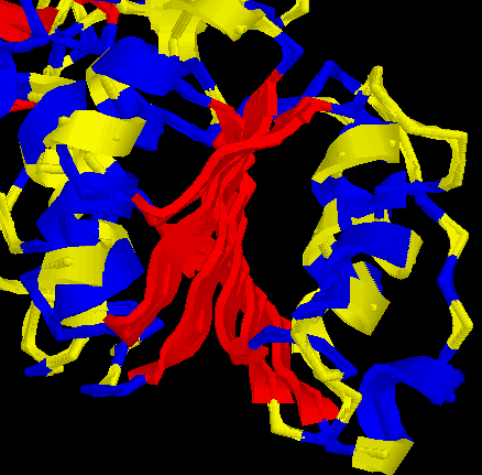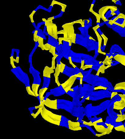 ![]() | RESPECTE AL MOTIU OPEN SHEET: En aquesta imatge, se´n destaca la disposició que adopten tant els residus polars (color groc) com els residus hidrofòbics (color blau) només per a les hèlix α que envolten el centre. Tot i que costa de veure, els residus més externs de les hèlixs, són polars i els residus orientats cap a l´interior (cap a les làmines β), són hidrofòbics. |