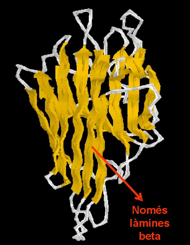 ![]() | La disposició d´aquestes dues fulles β constituïdes per vàries làmines β, delimiten una regió més interior i resguardada de qualsevol interacció (formada per aà. hidrofòbics) i dues superfícies més externes capaces d´interaccionar amb l´entorn i constituides bàsicament per aà. polars. |