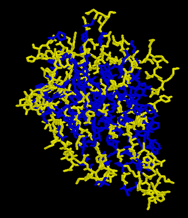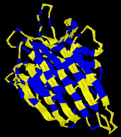![]() | En aquesta imatge podem apreciar una visió general de la disposició dels diferents aà. en les diferents fulles β que formen la proteïna. En color groc es destaquen els aà. polars i en blau, els hidrofòbics. |
