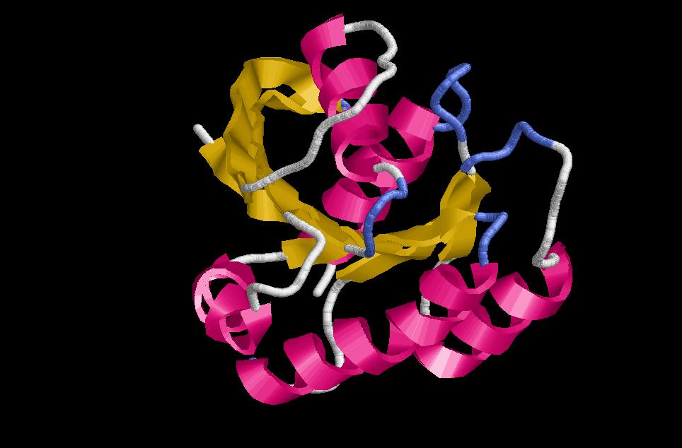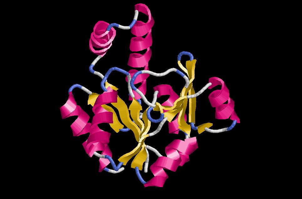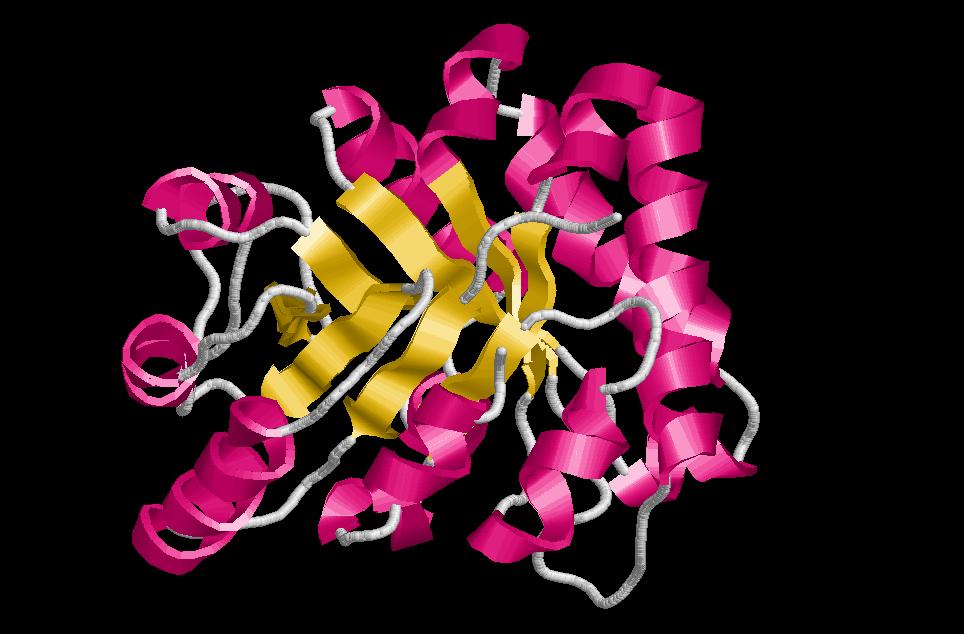 $ rasmol open-sheet-alfabeta (la traducció al català seria fulla oberta). Com a curiositat direm que aquesta estructura és característica del plegament Rossmann. A diferència del TIMbarrel, que veurem a continuació, la fulla beta no es tanca com a barril, ja que hi ha hèlix alfa a ambdues bandes les fulles beta. Aqueste hèlix estan empaquetades a banda i banda de les fulles beta. Es troben sempre dues fulles beta adjacents les conexions de les quals es fan en direccions oposades. Un dels loops va per sobre mentres que l’altre va per sota. Aquesta distribució crea una clivella o fenedura en la qual es situa el “centre actiu” o binding domain de la molècula. En el diagrama topològic s’observa un canvi de direcció provocat per l’hèlix alfa i un canvi de sentit. Aquest punt de canvi s’anomena switch point i és on es localitza el centre actiu de l’enzim. Adenilato ciclasa, carboxypeptidasa, flavodoxin, lactat dehydrogenasa, alcohol dehydrogenasa,... entre d’altres són proteïnes amb aquest tipus de plegament.