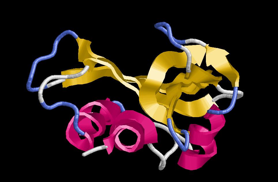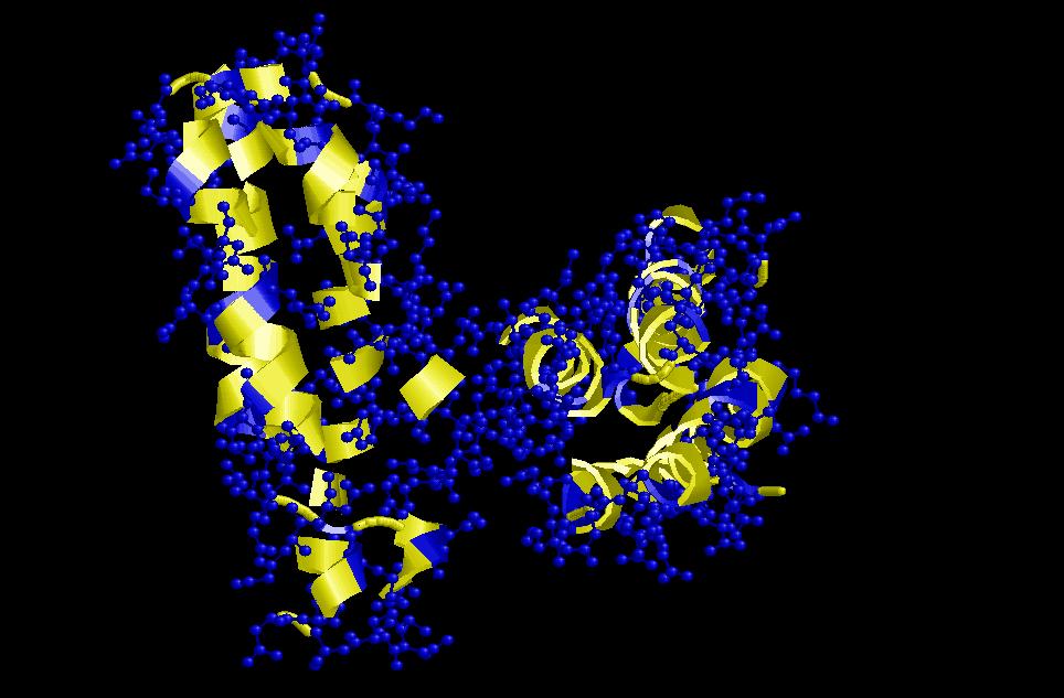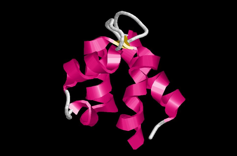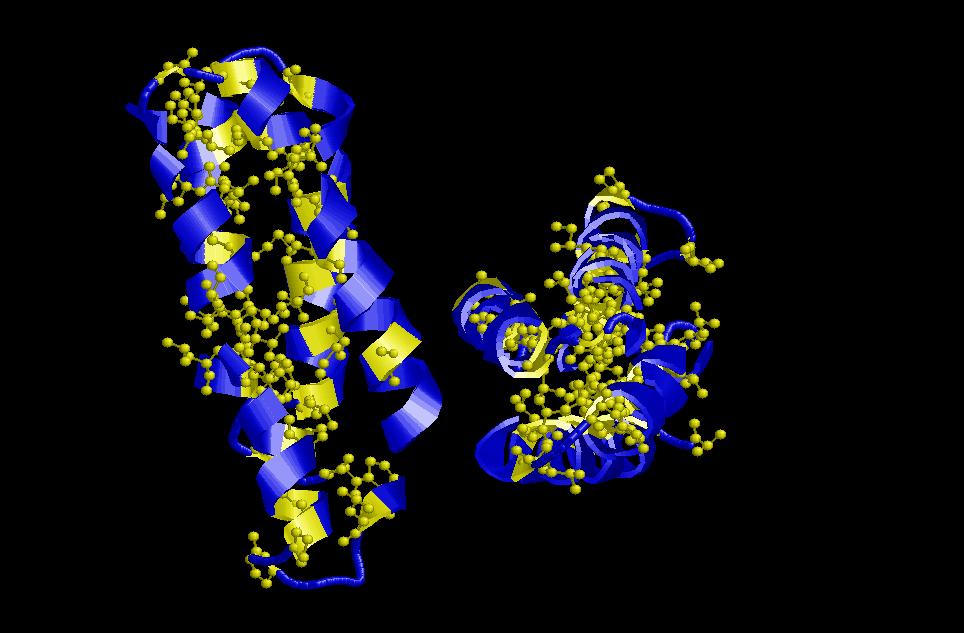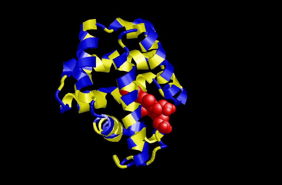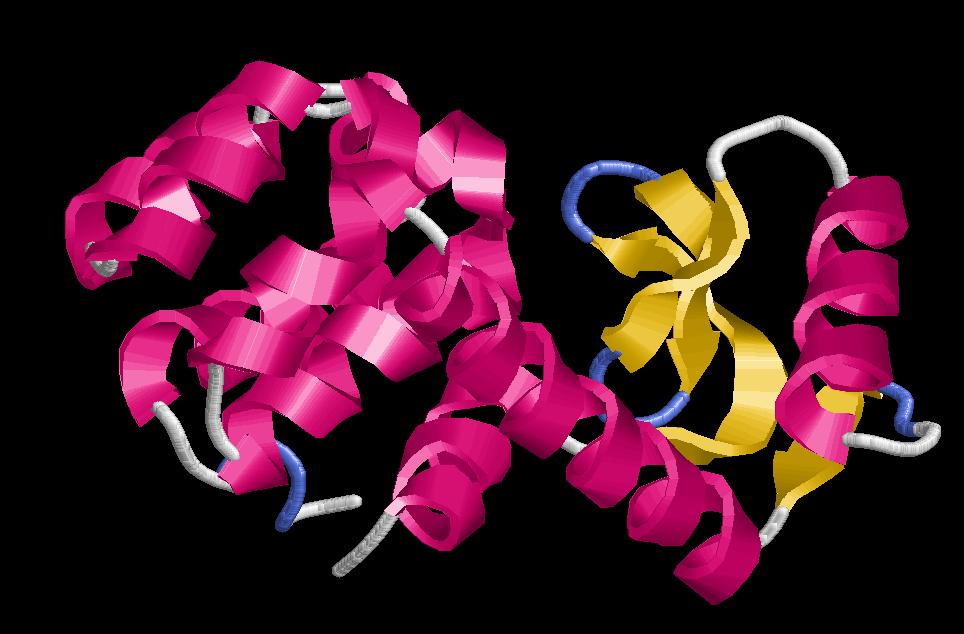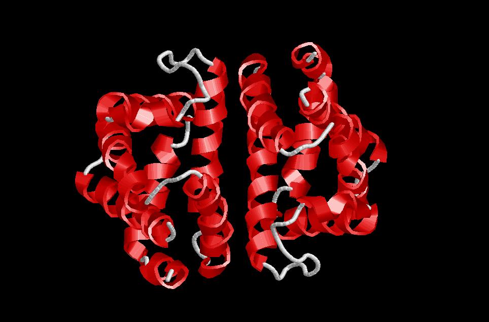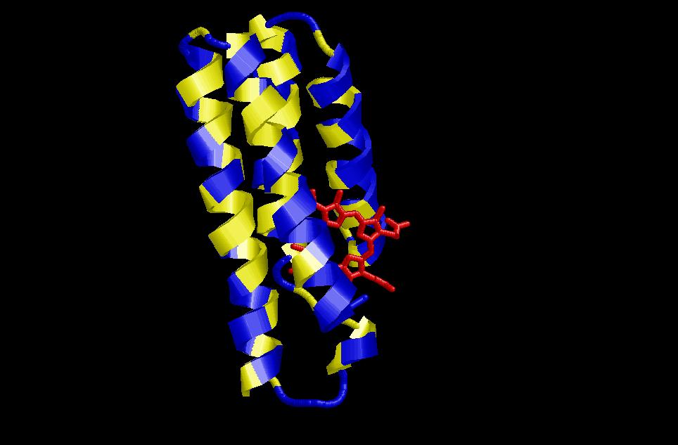 $ rasmol globin (també és una estructura de només hèlix alfa (globin-like), però ara en comptabilitzem 6, 3 de les quals formen un angle de 50º entre les respectives cadenes i la resta de 20º). Es una de les estructures alfa més importants. I ha estat descrita en un gran nombre de proteïnes, entre elles la hemoglobina i la mioglobina, de gran importància en el cos humà. Aquí també trobem un nucli central hidrofòbic on es localitza el centre actiu de l’enzim (tant en la mioglobina com en la hemoglobina aquest centre actiu és el d’unió a grup hemo) i una part exterior polar que interaccionarà amb les molècules d’aigua de l’ambient.