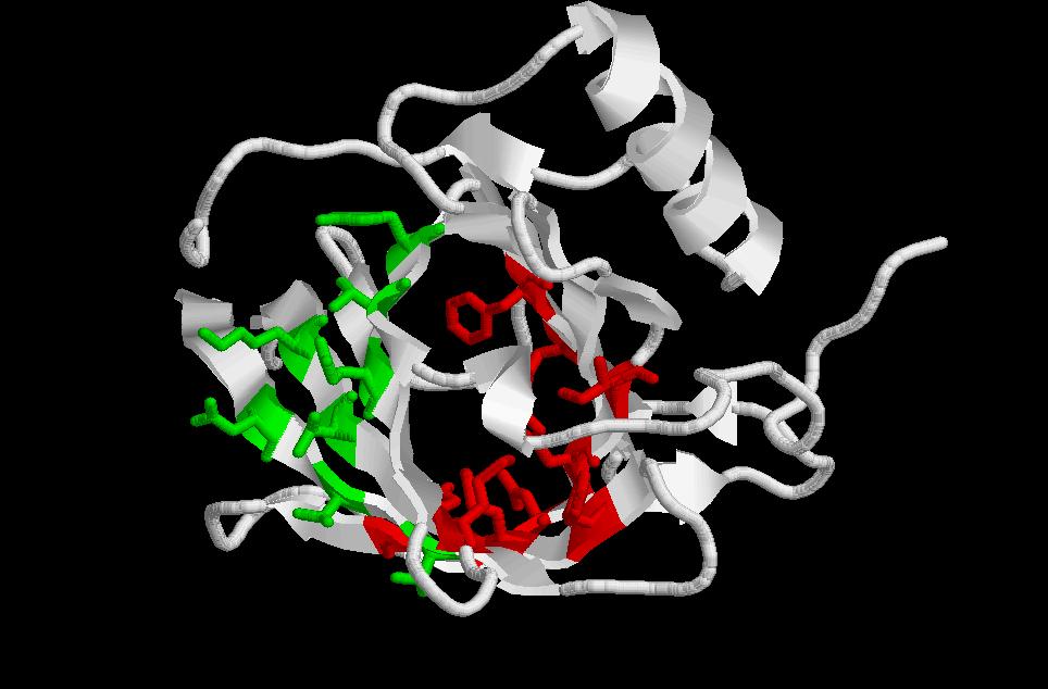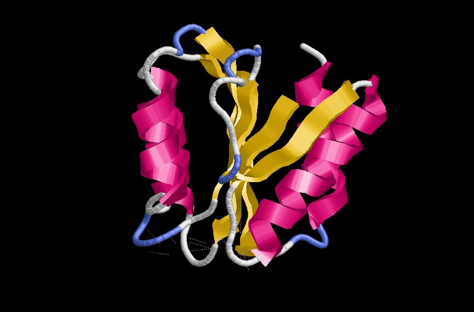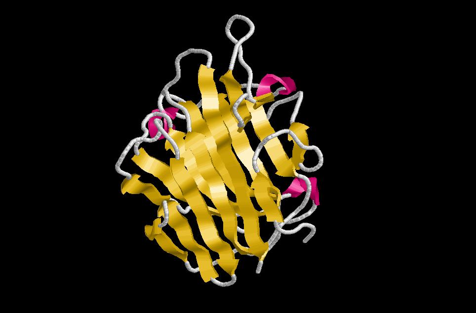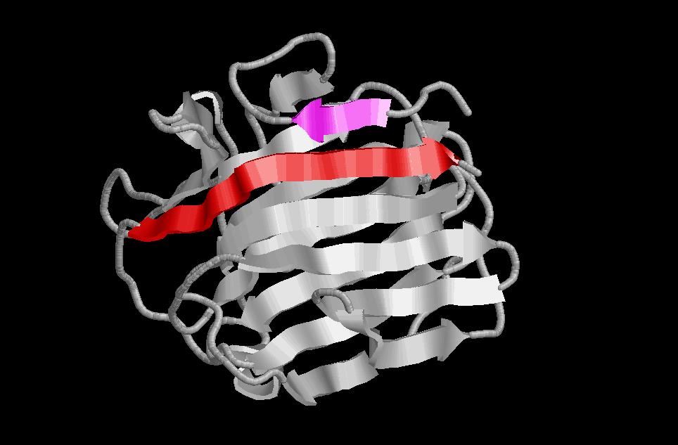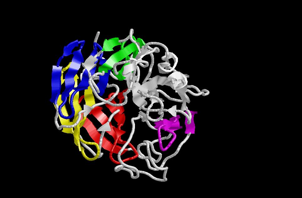 $ rasmol sandwich-greek-key (Es tracta d’una estructura de dos beta greek key situades una davant de l’altre com en un sandwich de làmines beta donant lloc a una representació topogràfica on la làmina beta 1 forma ponts d’hidrogen amb la 4). A la fotografia de la dreta he marcat un greek key amb colors a les diferents beta sheet, perquè es vegi com es replega sobre si mateixa.
