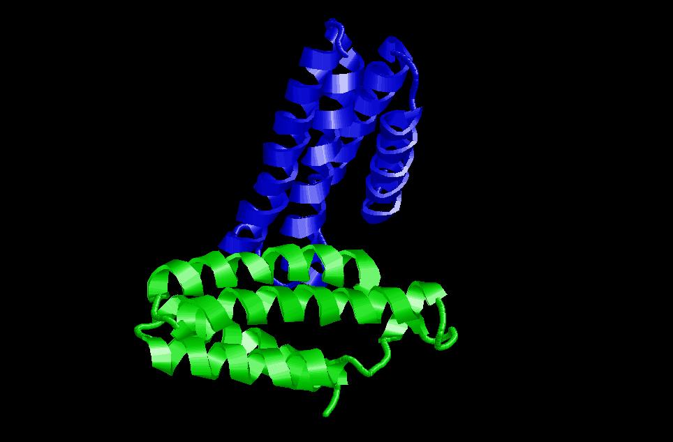 $ rasmol 4helix-bundle (es tracta d’un proteïna amb dos four-helix-boundle domain idèntics, que són 4 hèlix alfa antiparal·leles; col·locades perpendicularment). La col·locació de les hèlix alfa entre elles forma un angle de 20º. Podem trobar aquest tipus d’estructura en proteïnes com el citocrom c, la ferritina, etc.