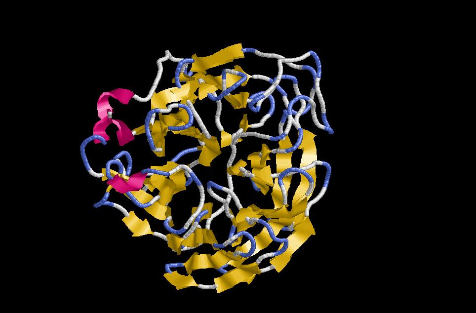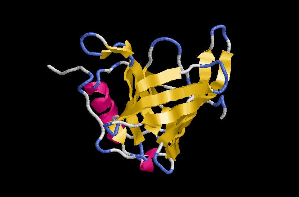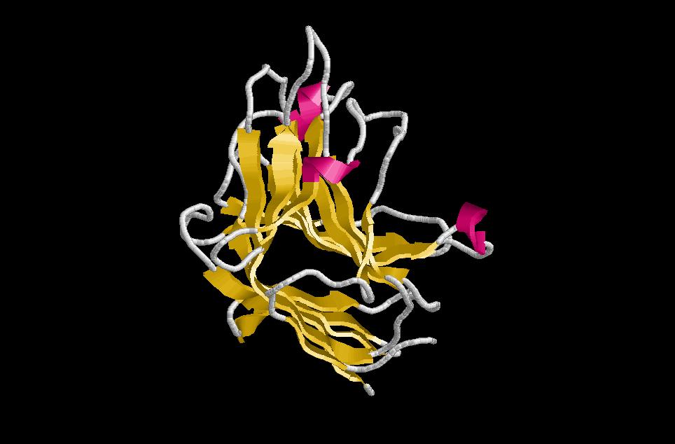 $ rasmol jelly-roll (plegament format per 2 motius greek keys que adquireixen un plegament especial). Depenent de com sigui el camí de plegament, aquest pot donar lloc a un forma de barril o de sandwich. De totes maneres hi ha uns requisits característics d’aquest plegament que faciliten la seva identificació: posició de la làmina N terminal (rosa) propera a la C terminal (vermell), presència de motius greek key i no de beta menadres, forma aproximada de barril i creuaments dels loops entre les cadenes per sobre del barril.