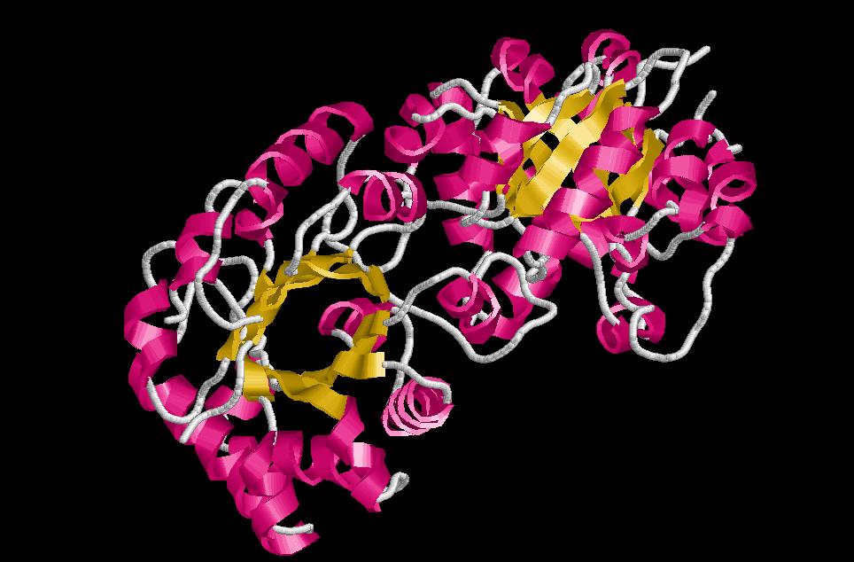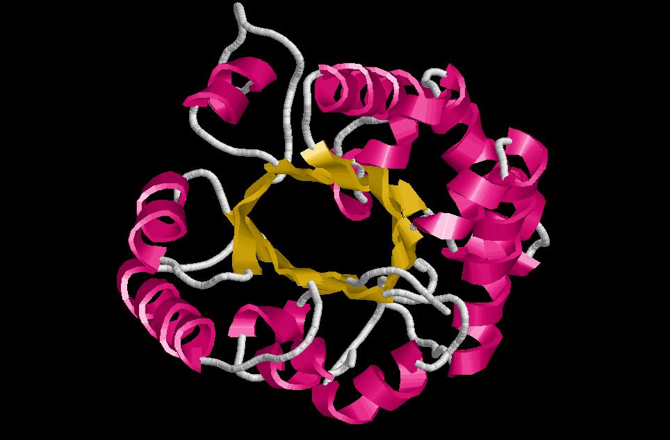 $ rasmol TIMbarril (estructura de doble capa: làmines beta a l’interior formant una cabvtat de caràcter hidrofòbic i hèlix alfa envoltant aquest cilindre per la part exterior). El centre actiu en totes les proteïnes d’estructura alfa/beta barrel es troba en una posició similar: en una butxaca creada pels 8 loops que connecta la part carboxy terminal de les làmines beta amb l’amino terminal de les alfa. I els residus que inervenen en la catàlisis de la reacció estan en aquests loops (que d’altra banda no tenen cap mena de contribució estructural). En el barril, la banda hidrofòbica de les hèlix alfa estan encarades a la hidrofòbica de les cadenes beta sheet. Les hèlix alfa són antiparal·leles i adjacents a les làmines beta amb les que estan connectades.