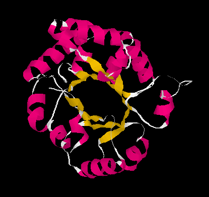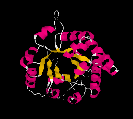 | Figura 4: s'observa el barril de làmines β (groc) a l'interior envoltat per hèlix α (rosa).