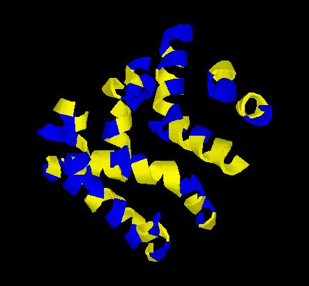 | Figura 6: la part interna de les hèlix presenta un alt nombre de residus hidrofòbics (groc), mentre que la part externa és majoritàriament polar (blau).