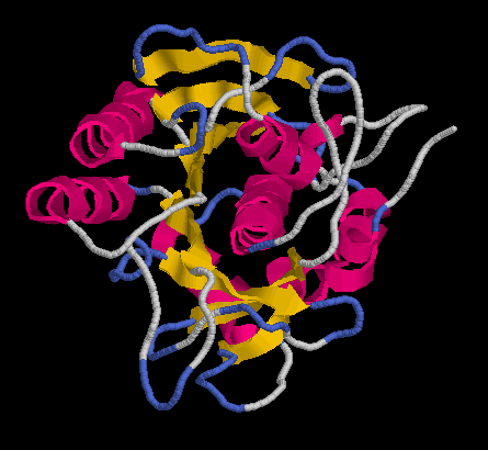 En aquesta proteïna trobem combinades hèlix α i làmines β disposades de tal manera que les làmines β queden a l'interior envoltades per les hèlix α (figura 1). Aquests componen un plegament de classe α/β, ja que podem veure que les hèlix α i les làmines β s'alternen (figura 2). Dintre de la classe α/β es tracta d'un open-sheet, ja que està format per un nucli hidrofòbic compost per un full β, envoltat per hèlix α apolars a la part interior (formant part del nucli hidrofòbic) i polars a la part exterior (figures 3 a 4).