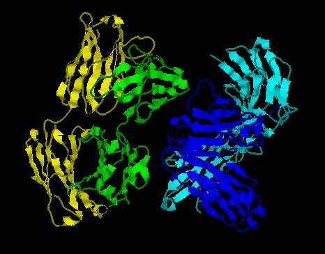| Figura 1: s'observen les quatre cadenes, A, B, C i D, representades de color blau, cià, verd i groc respectivament. A i B es troben molt properes, formant una unitat funcional, així com C i D.