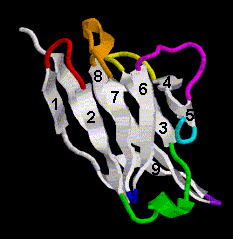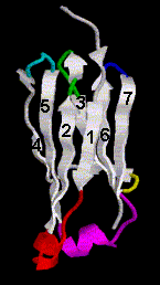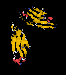 Aquesta proteïna es troba formada per quatre cadenes A, B, C i D que es troben encarades dos a dos (A amb B i C amb D) (figura 1) i presenten el mateix tipus de plegament (figura 2). A partir d'aquest moment, em centraré en la cadena A per explicar el plegament, però tot el que es comenti és també aplicable a les altres. En cada cadena hi ha dos dominis diferents, (figura 3), ambdós amb plegament de tipus tot β ja que està compost exclusivament per fulls β (figura 4). Ambdós dominis són de tipus Greek-key β-sandwich, ja que el domini està format per motius greek-key, que formen dues fulles β enfrontades una a l'altra. (figures 5 i 6).