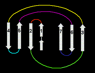| Figura 6: greek-key β-sandwich de la part inferior (encerclada en verd en la figura 3). A l'esquerra imatge estructural, a la dreta, diagrama topològic. Es pot veure que, com en el cas anterior, queden dues làmines β (greek-keys) enfrontades formant un sandwitch, una composta per les cadenes 1, 2, 4, 5; i l'altre per les cadenes 3, 6, 7.