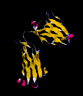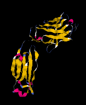 | Figura 4: s'observa que pràcticament la totalitat de l'estructura està formada per làmines β (groc), tot i que s'observen algunes petites hèlix α (rosa).