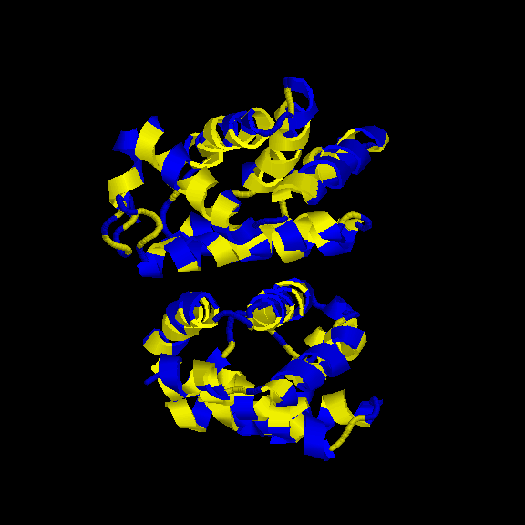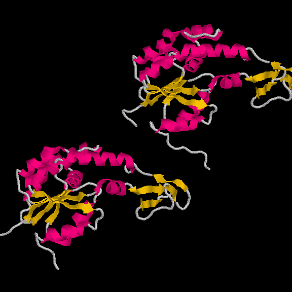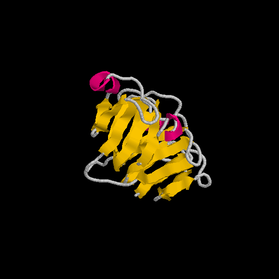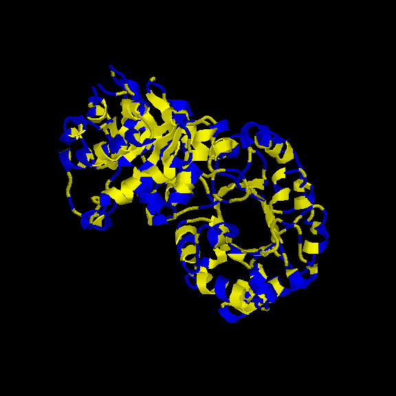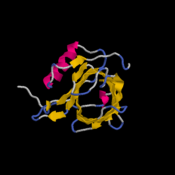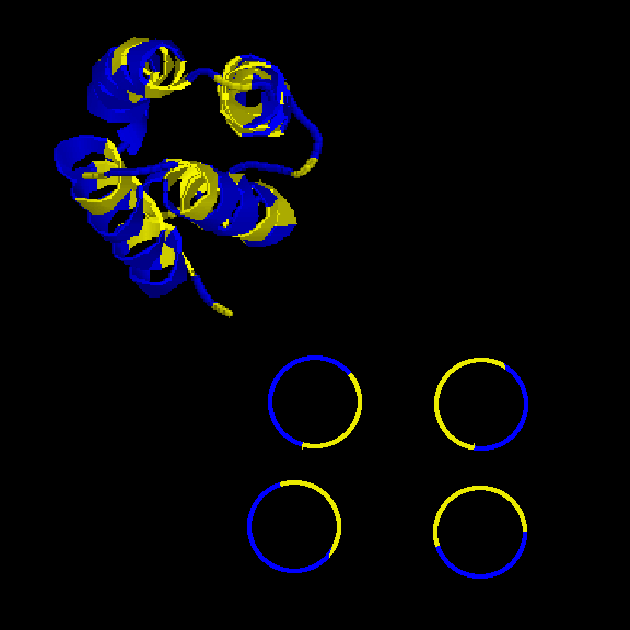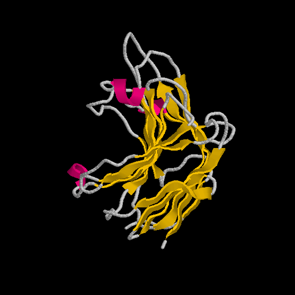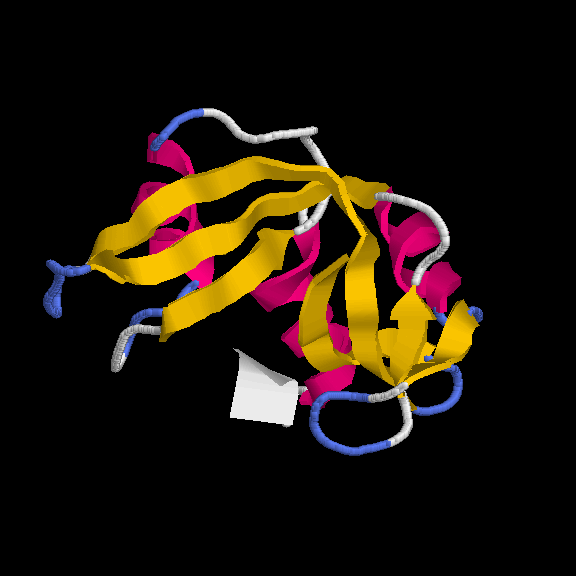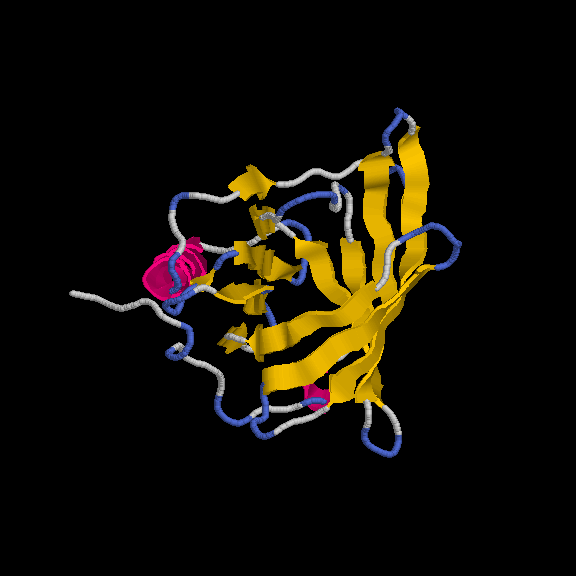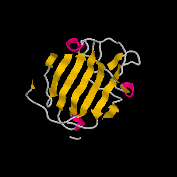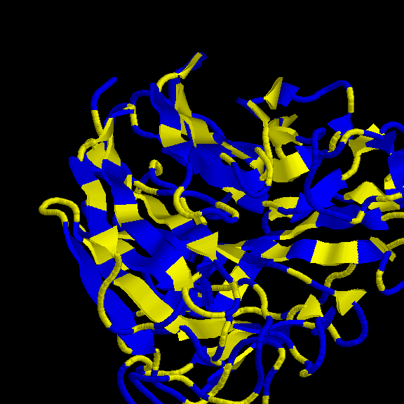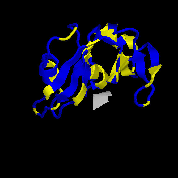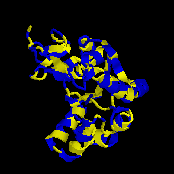 És un clar exemple de les estructures del tipus "alpha + beta" on, tot i que trobem tots dos tipus d'estructura secundària, aquestes no es troben de forma alterna, si no que es succeeixen en l'estructura (és a dir, primer un tipus, i després l'altre). En aquest cas, s'ha intentat incidir en aquest punt a l'hora de capturar la primera imatge. Tal com es veu, els loops que uneixen les llàmines, van a altres làmines beta, de la mateixa manera que els loops que surten de les hèlix alpha connecten amb altres hèlix alpha (es veu clarament entre la primera i segona hèlix del fons). Pel que fa a la distribució dels residus polars i hidrofòbics, també trobem cert patró, tot i que no tan evident com a altres estructures. A la captura s'ha intentat reflexar com es produeix certa agrupació de residus hidrofòbics cap el centre de la molècula (formant així un nucli d'hidrofobicitat), mentre els exteriors, més exposats al solvent, serien, en la seva majoria, residus polars. |