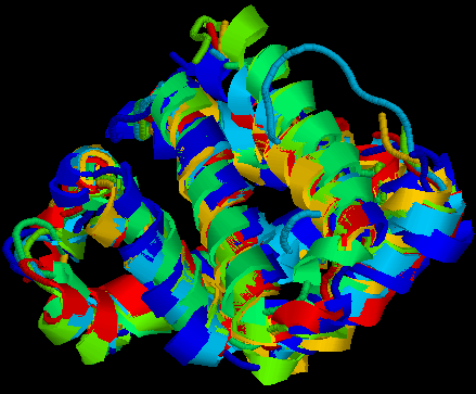 Cadascuna de les estructures superposades ha estat marcada amb un color diferent. Es pot apreciar com l'estructura és molt més ben conservada a les regions que contenen hèlix que als coils, fet que demostra la hipòtesi de que aquelles regions amb una funció determinada tendeixen a conservar-se molt més en l'evolució degut al fenomen de la selecció negativa dels mutants. |
