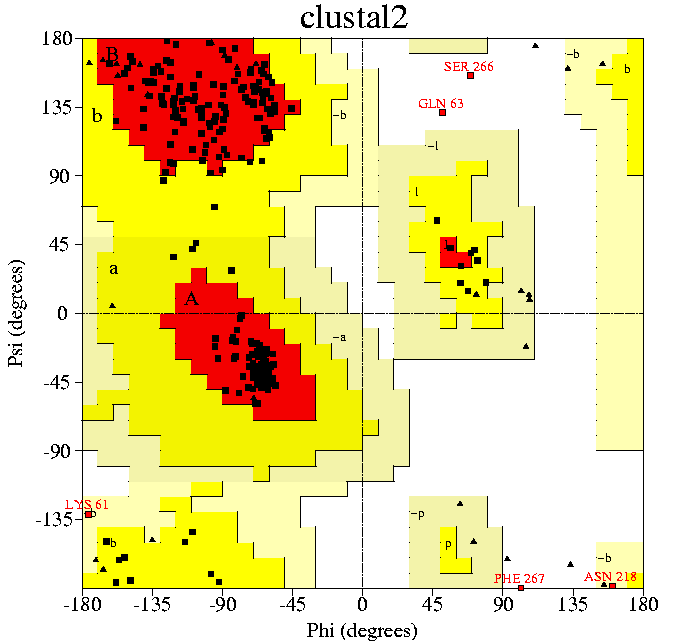 Al model clustal1 trobem que hi ha 3 residus (lys 61,asp73,ser266) que estàn en posicions "disallowed" (no permeses) mentre n'hi ha 3 que estan en regions rarament permeses. |