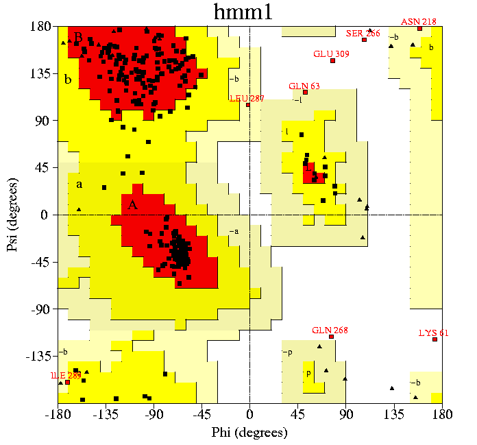 Aquest model està millorat respecte a l'altre realitzat amb l'alineament de hmm. Tal com es veu al plot, les úniques posicions que ens criden l'atenció són àtoms que estàn en posicions permeses "generosament",tret de la lys 61 que, tal com passava a l'altre model, queda en la zona "disallowed". |