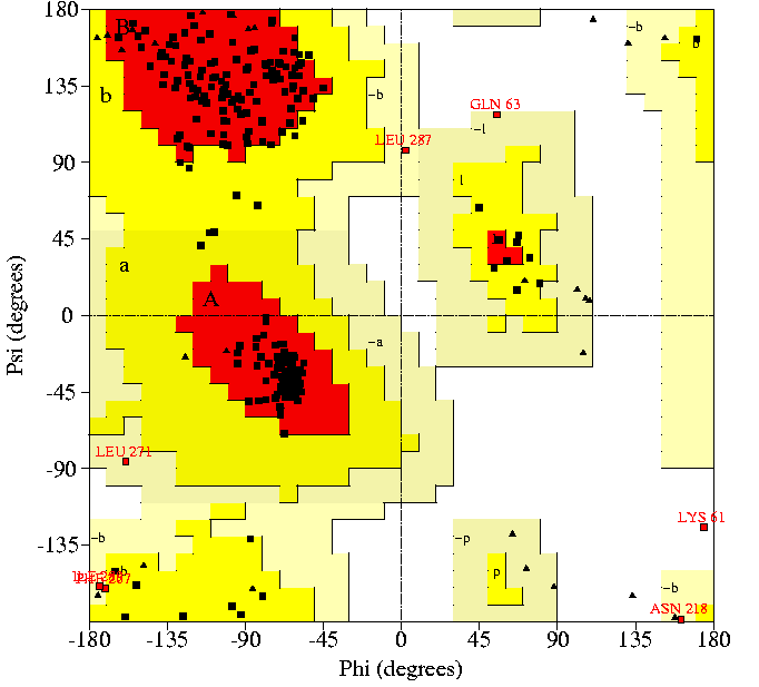 Aquest model (segon model generat amb l'alineament de seqüències) té molt més bona pinta que l'anterior. Trobem que el nombre de residus 'generosament' permesos és molt menor (només apareixen 2 al plot), i tenim tres residus que estan en posicions desfavorables (gln63,ser266,phe267) |
